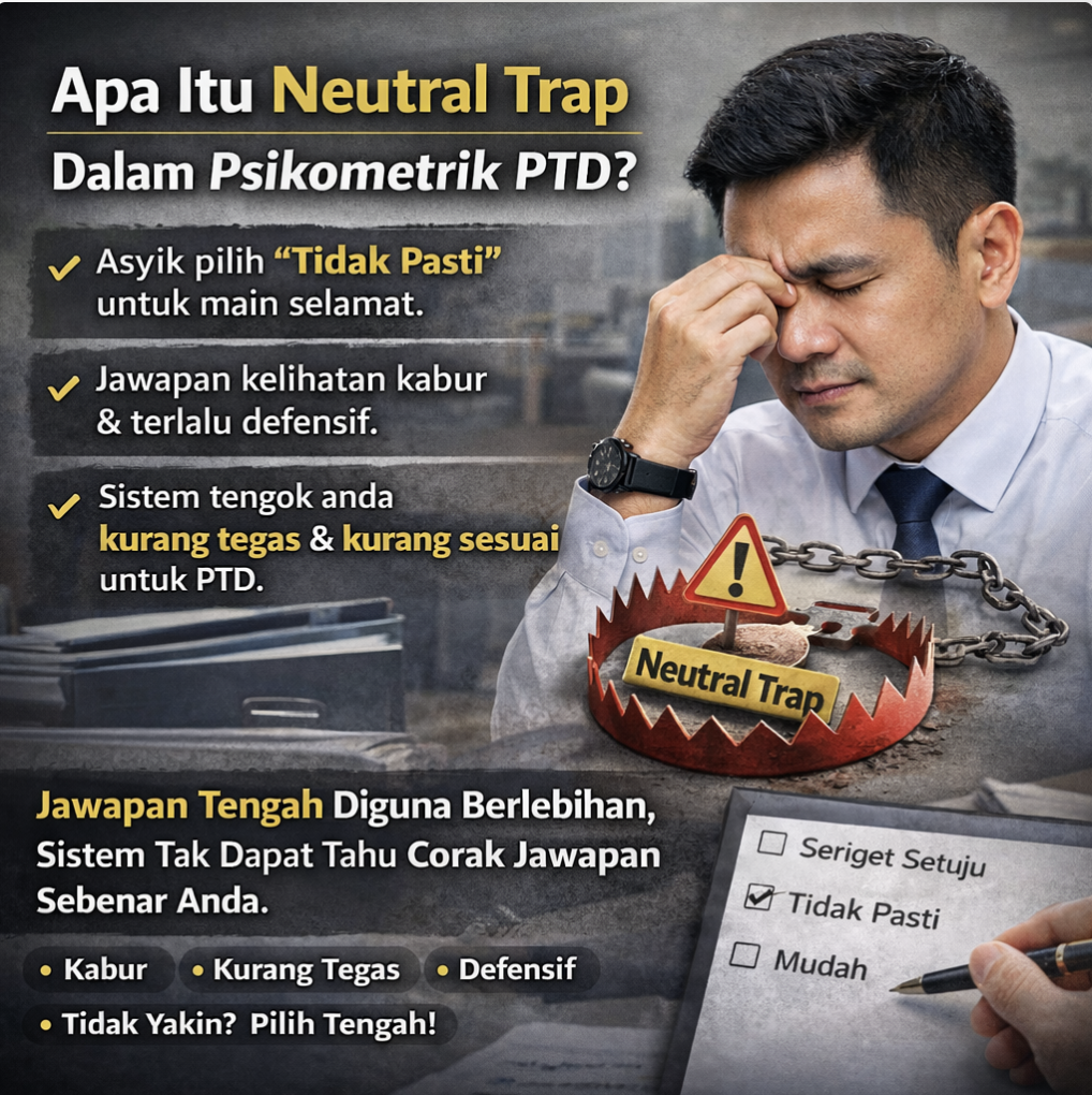 Neutral trap merujuk kepada keadaan apabila calon terlalu kerap memilih jawapan “Tidak Pasti”, bukan kerana benar-benar neutral, tetapi kerana takut tersalah jawab, mahu bermain selamat, atau tidak mahu menonjolkan kelemahan diri. Dalam psikometrik PTD, keadaan ini menjadi masalah kerana sistem tidak menilai satu item semata-mata. Sistem menilai sama ada jawapan anda membentuk satu profil yang jelas, stabil, dan sesuai dengan skim PTD.